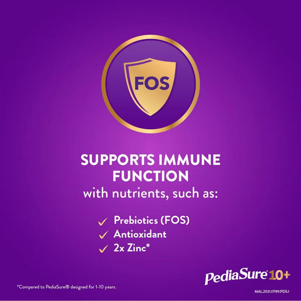 PediaSure® 10+ is a complete, balanced nutrition supplement, scientifically designed to support the nutritional needs during periods of accelerated growth in kids 10-15 years of age with a unique Triple Growth System, supporting increased height, energy release and overall growth and development. PediaSure® 10+ is suitable for children aged 10-15 years who: • Has limited intake of balanced nutrients i.e. carbohydrate and protein. • Eats few fruits and vegetables. • Very active but eats little • Always skipped meals i.e. breakfast • Has poor appetite. • Needs a nutritious snack or supplement. • Wants to catch up on growth PediaSure® 10+ Features: • Contains 38 key nutrients which includes arginine and 2X calcium*, 1.6x vitamin D* and 2x Natural vitamin K2* for building strong bones. • 25% more* Triple Protein Complex with 3 protein sources – milk protein concentrate, whey protein concentrate, and soy protein isolate provide a scientifically balanced blend of all essential amino acids to support growth and development. • Provide 100% daily requirement^ of Vitamin D which helps to promote calcium absorption. • Contains Vitamin A, D and Zinc which are important for the body. • Contains FOS, a non-digestible dietary fibre that is the preferred food of good bacteria. • Contains 1kcal per 1ml to provide extra energy for growing children. • Contains DHA to supports brain development. • Gluten-free. *compared to Pediasure ® designed for 1-10 years ^2 servings per day meets 100% MY RNI 2017 for Vitamin D MAL.2021.17954.PDS.1