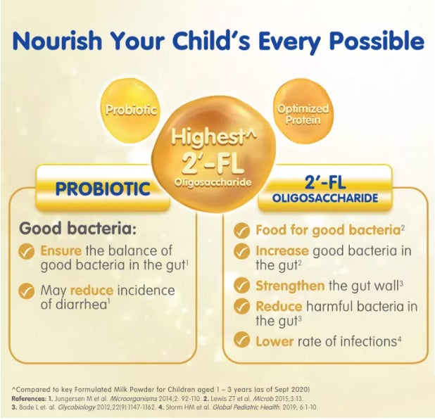 NANKID OPTIPRO Step 4 is for children ages 4 years and above. It is formulated with Immunity Guardians which consist of 2’-FL Oligosaccharide and Probiotic B. lactis. These ingredients work together to strengthen your child’s immune system, which helps them reduce the risk of infections while supporting their growth and development.